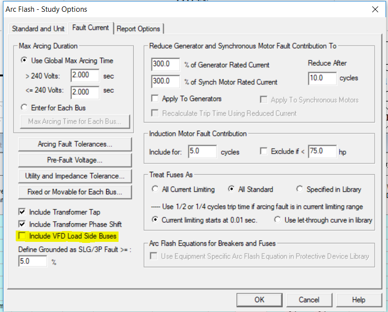 If there are less than 100 buses in a project and "Include VFD Load Side Buses" box is unchecked in the Arc Flash Study Option window, the program will still report the VFD Load side buses.