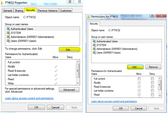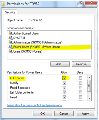 6) Click Ok and you are done. Now you can try login as a “Power User” and it should work. Solution #3: Make a copy of the original installation folder again when logged in as Power User – It will by default set Power Users as one of the owners If you are logged in as a “power user” and want to fix it yourself, here is what you can do: 1) Copy everything in C:\PTW32 to say C:\PTW32_New 2) Delete C:\PTW32 3) Rename C:\PTW32_New to C:\PTW32 4) Run PTW32 and it should work