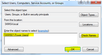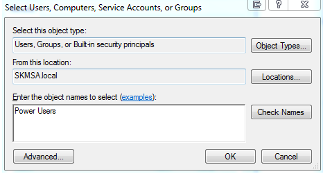 4) Click check names to pick the fully qualified name of the group (Please note that in the screenshot below I picked local machine “Power Users” group – you can actually pick a domain one if available)