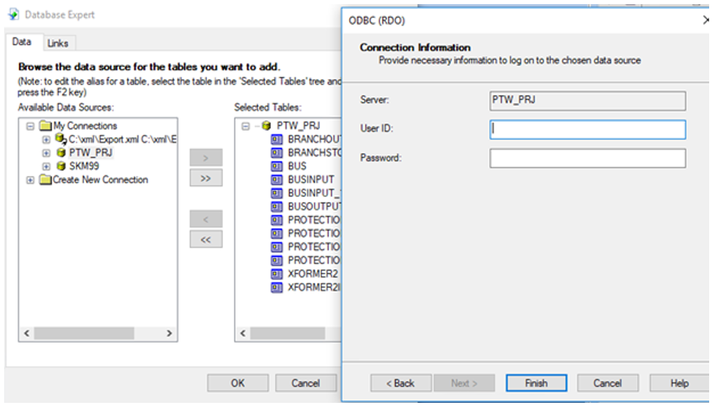 6) Open Crystal Report 16 and create a new report or open an existing report. Go to Database menu and select Database Expert so you can create a New Connection. When making the connection to the ODBC, you don’t need a User ID or Password. Click on Finish.