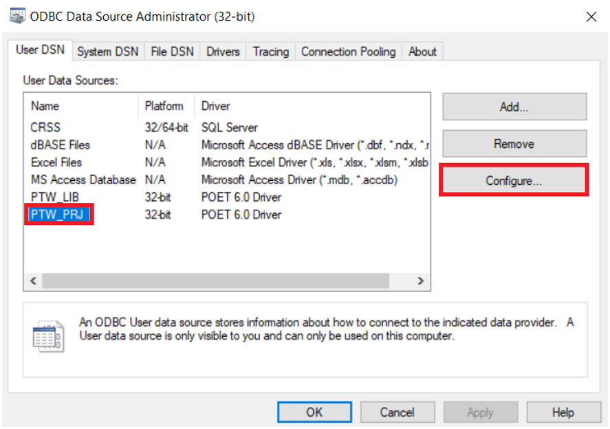 3) This will open ODBC Data Source Administrator (32-bit). Under User DSN, select PTW_PRJ and click on Configure…