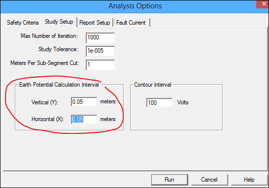The GroundMat study was able to finish although it took several hours to complete. However the Earth Potential, Touch Voltage, and Step Voltage took several minutes to load (more than 15 mins on some). This is due to having a large amount of data to load (several hundred MB of data) - caused by the very small intervals set in the study options shown below. The study area is about 220m which has to generate points in 0.05m intervals. This is very small which will cause to slow down the study and loading process.