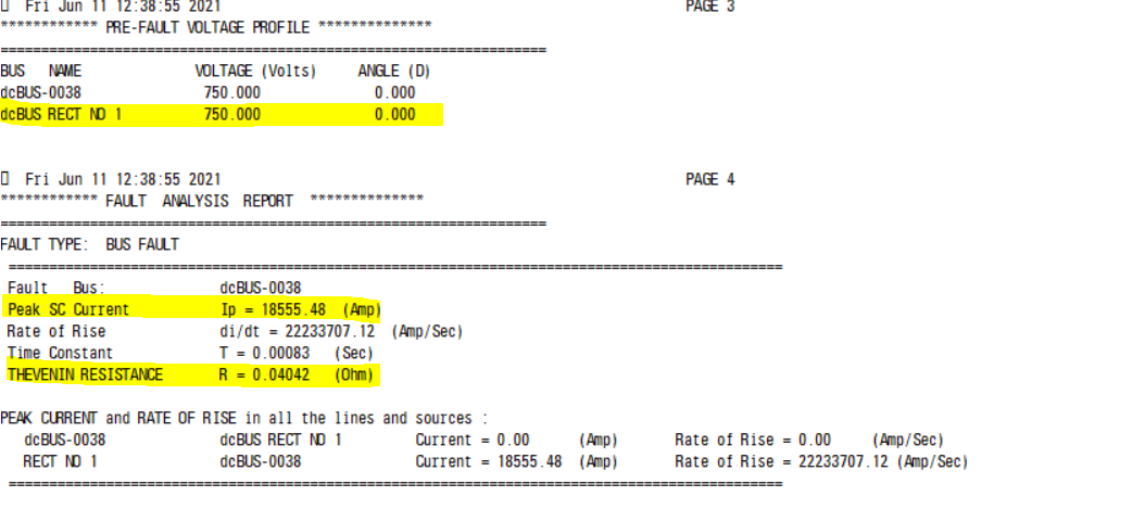 The calculation for the Peak SC current in DC short circuit is based on the bus voltage and the Thevenin resistance.