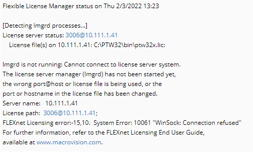 After a user logs off PTW, they cannot login again. It appears the FlexLM license server has stopped and needs to be restarted to allow users to open PTW again. They keep restarting the license server every time a user logs out.