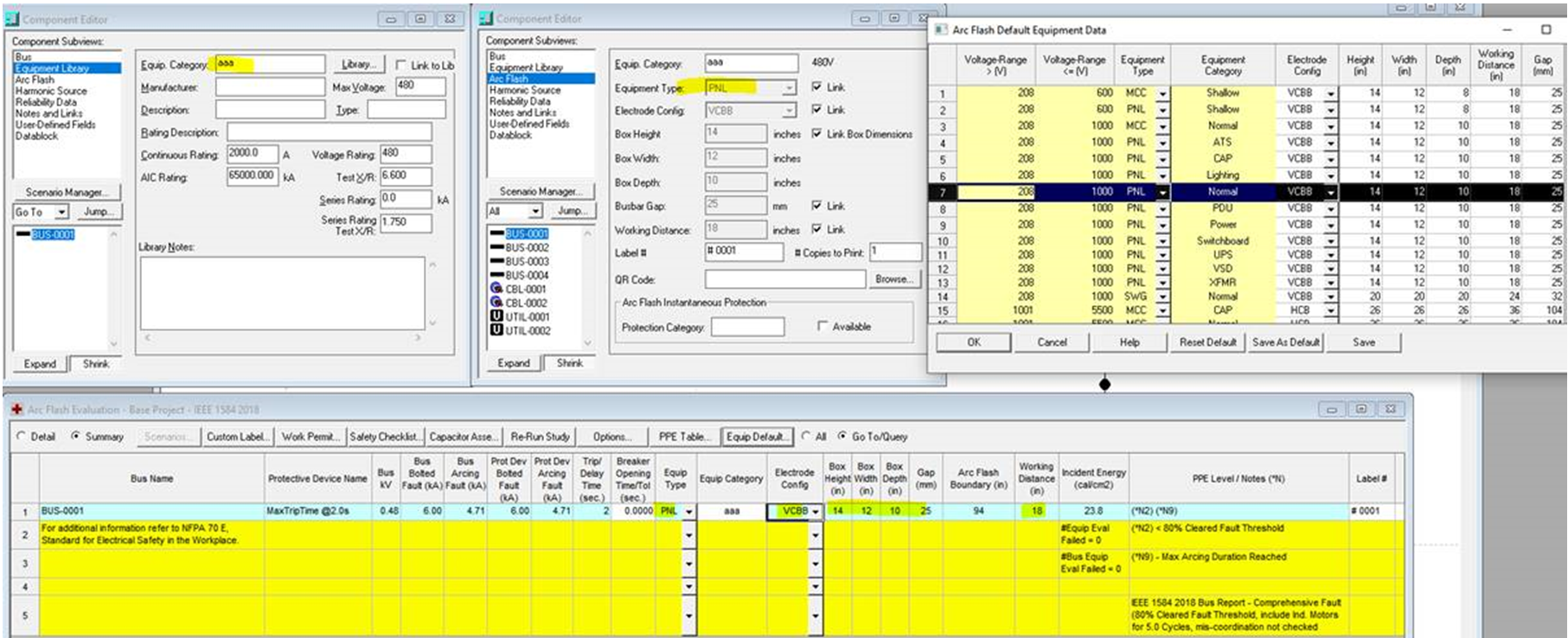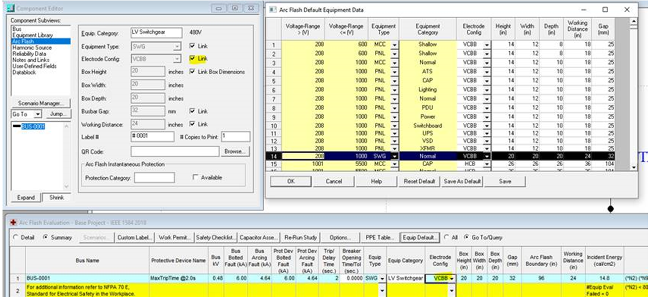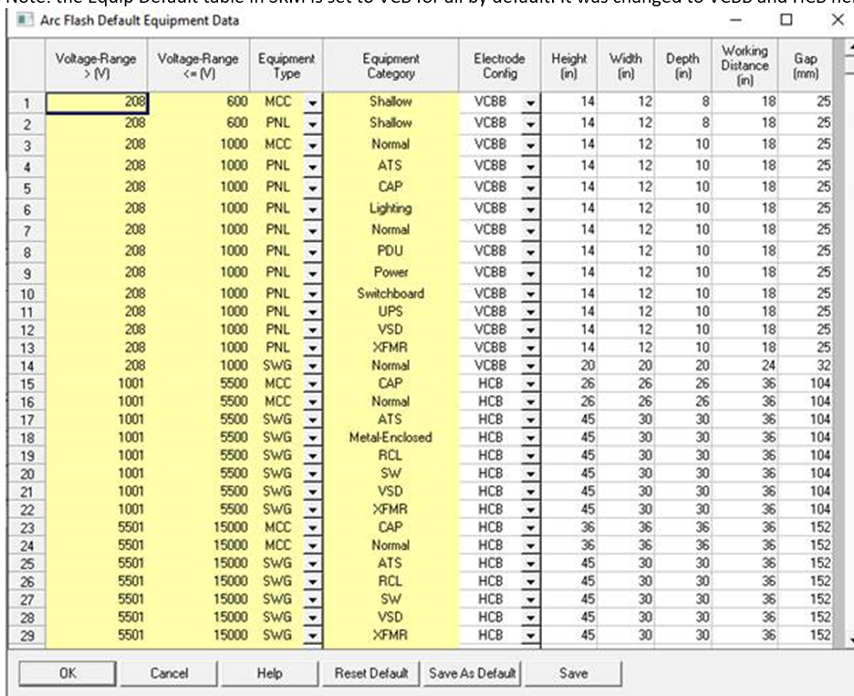 2. When you run Arc Flash, the program will check the equip default table using 3 criteria: bus voltage, equipment type, and equipment category (yellow parameters) then populates the other parameters (EC, Box Dimensions, WD, gap) when it finds a match: