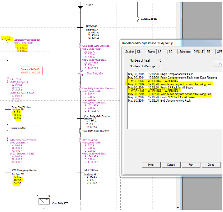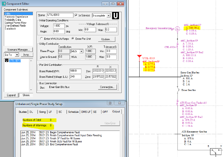 Answer: The reason the Unbalance Single Phase short-circuit study is not allowing to model this configuration is ATS switch, which is isolating the Utility network, therefore no swing bus is really defined for the study. Since we do not allow Single-Phase generators to be a “Swing-Bus” then the alternative and the only other way to model it would be to insert a “dummy” utility in parallel to the Emergency Generator and enter large impedance values so that the utility contribution is close to 0.